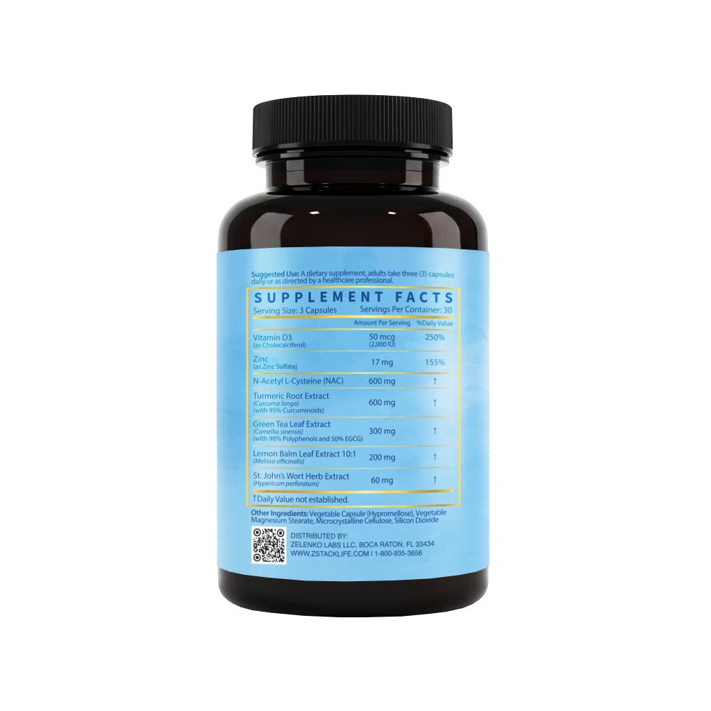 St. John's Wort 60 mg, Lemon Balm 200 mg, Turmeric 600 mg, Vitamin D3 2,000 IU, Zinc 17 mg, NAC 600 mg, EGCG 300 mg
